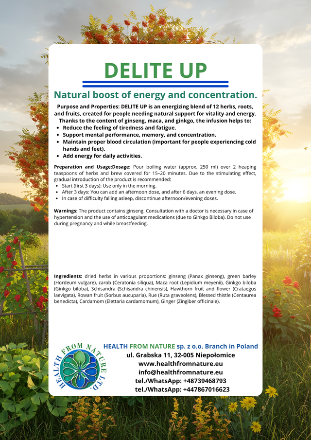 DELITE UP to energetyzująca mieszanka 12 ziół, korzeni i owoców, stworzona dla osób potrzebujących naturalnego wsparcia witalności i energii.