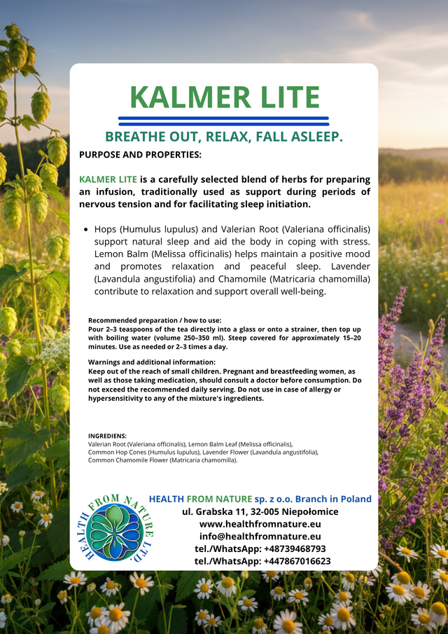 KALMER LITE to starannie dobrana mieszanka ziół do sporządzania naparu, tradycyjnie stosowana jako wsparcie w okresach napięcia nerwowego i dla ułatwienia zasypiania.