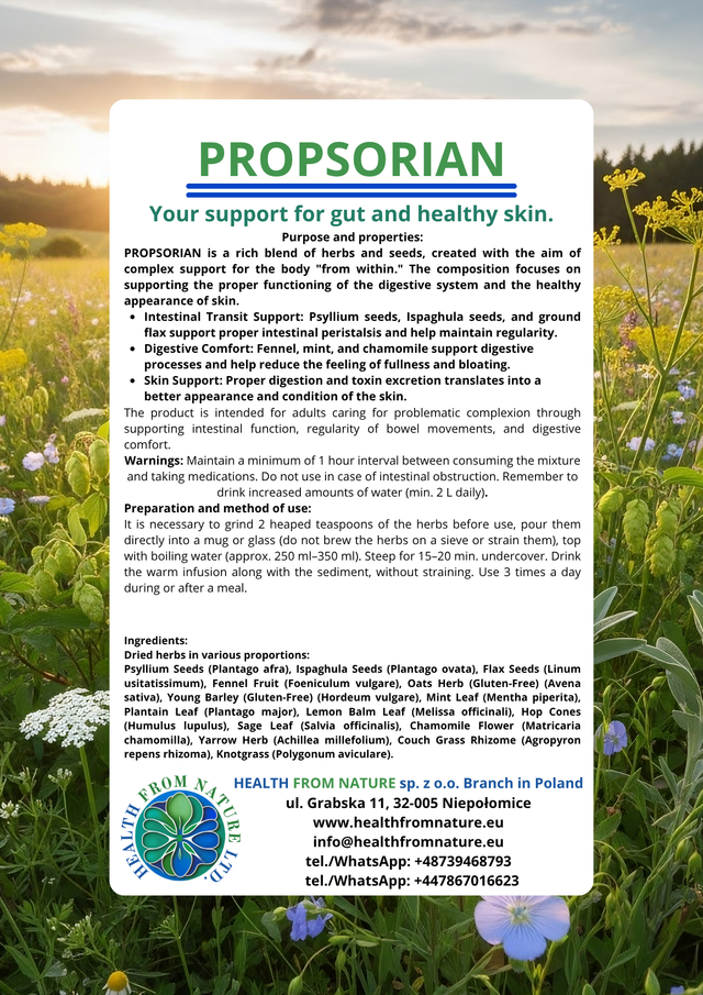 PROPSORIAN to bogata mieszanka ziół i nasion, stworzona z myślą o kompleksowym wsparciu organizmu "od środka". Kompozycja koncentruje się na wsparciu prawidłowego funkcjonowania układu pokarmowego oraz zdrowego wyglądu skóry